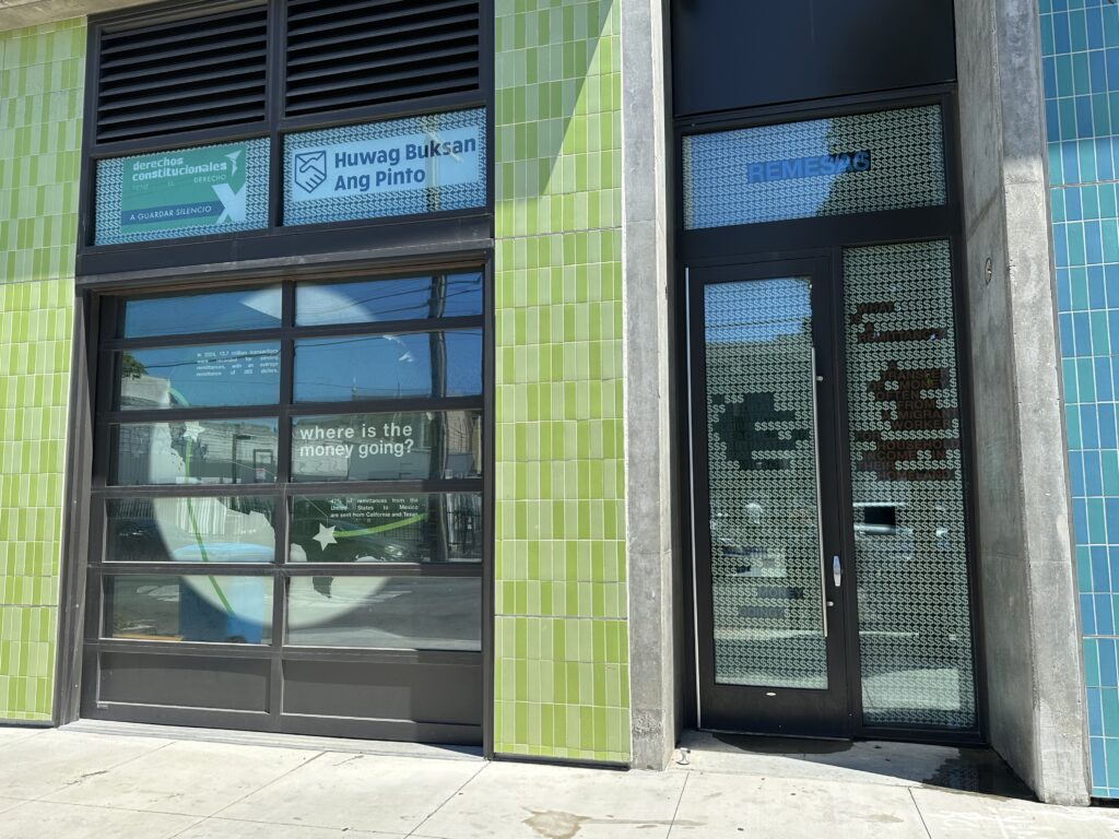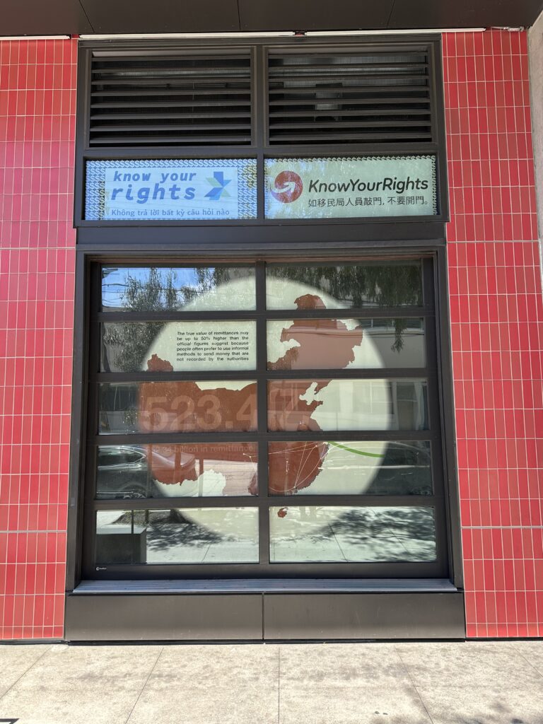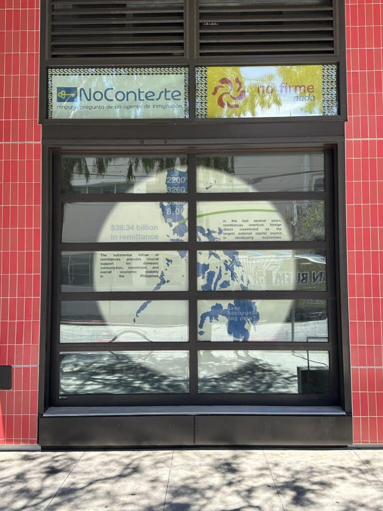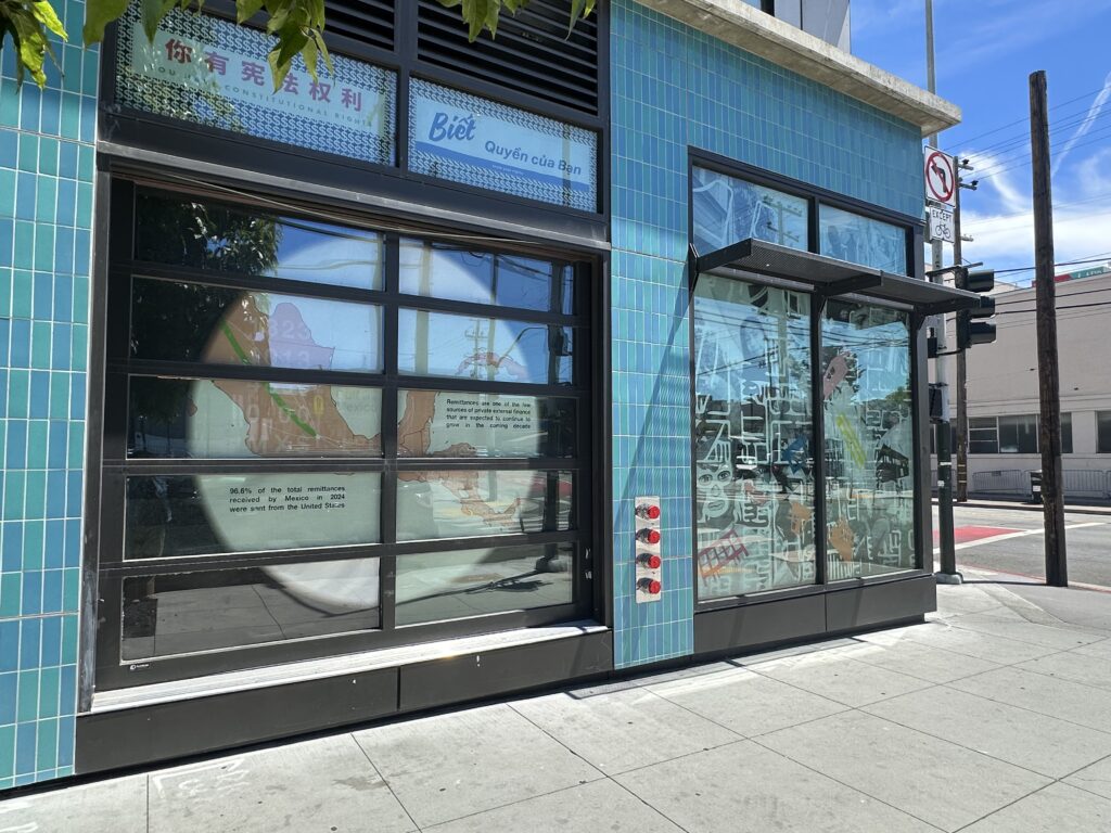 The Window Project is designed to foster a sense of inclusion and representation by incorporating topics of conversation that shape the Mission District and its residents. In their design, the students of “Artist as Citizens” examine topics such as immigration, remittances, street vendors, and cultural pride while including localized elements unique to the neighborhood such as maps, photography, quotes, and information on individual rights. This design incorporated additional collaborations with students from Leonard R. Flynn Elementary School and the “Performing Arts and Social Justice” class at USF taught by Professor Roberto Gutièrrez Varea to include the perspectives of those living in the neighborhood.